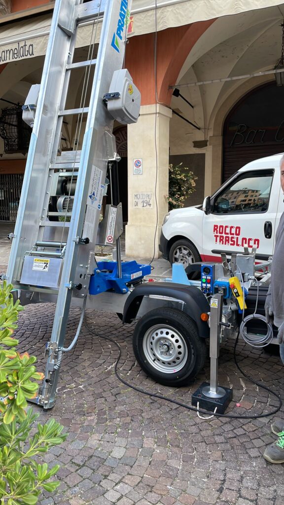 L’automezzo è in grado raggiungere piani alti di un certo edificio e può trasportare, direttamente a terra, scatole pesanti o mobili ingombranti.
